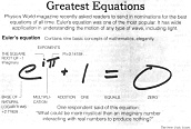 logaritmen. = pi = 3,14159..., o.a. verhouding omtrek/diameter cirkel. = √-1, imaginaire eenheid met i2 = -1. = een van de belangrijkste "getallen" uit de getallenleer. = operatoren uit de algebra. |