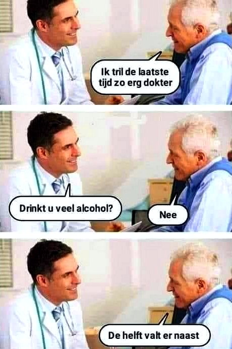 alcoholic / alcoholist 3-3-2023 I tremble so much lately, doctor. Do you drink much alcohol? No. Half is spilled. |
